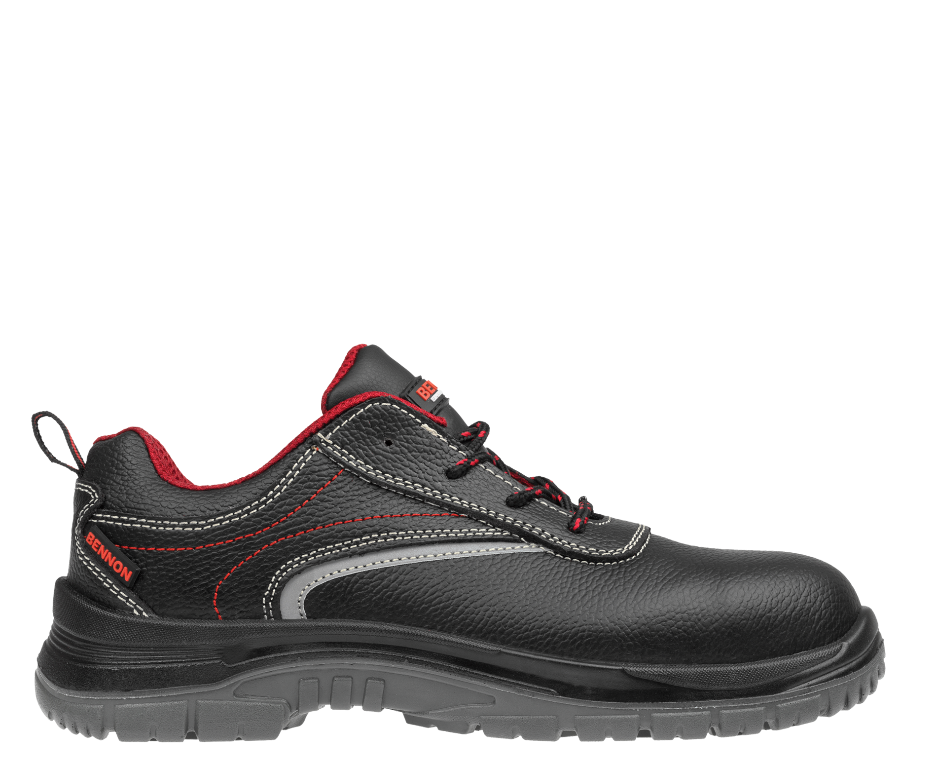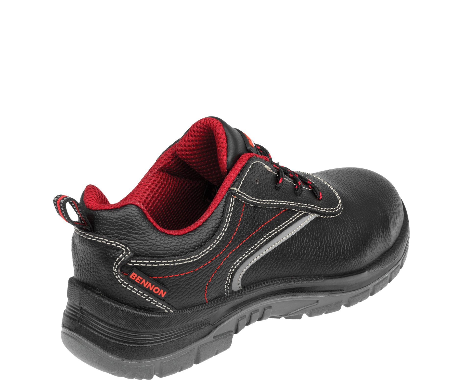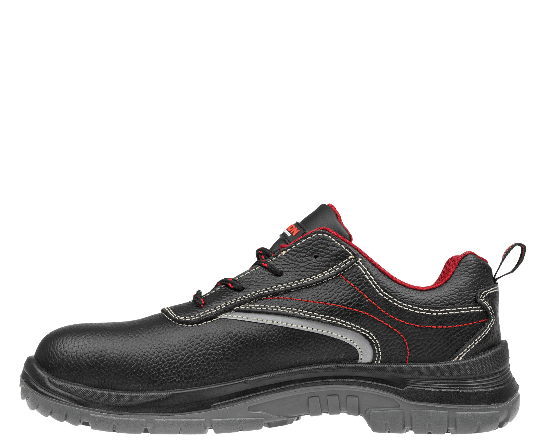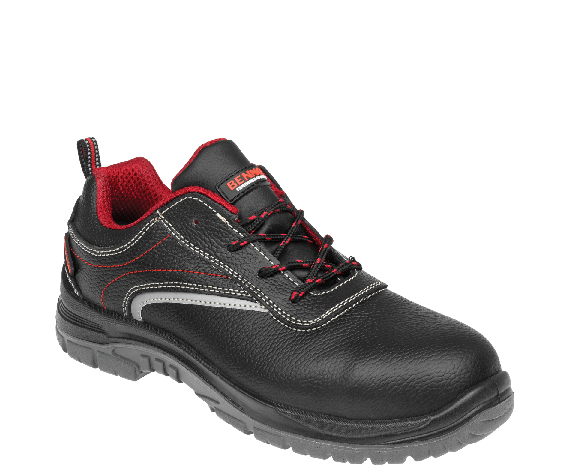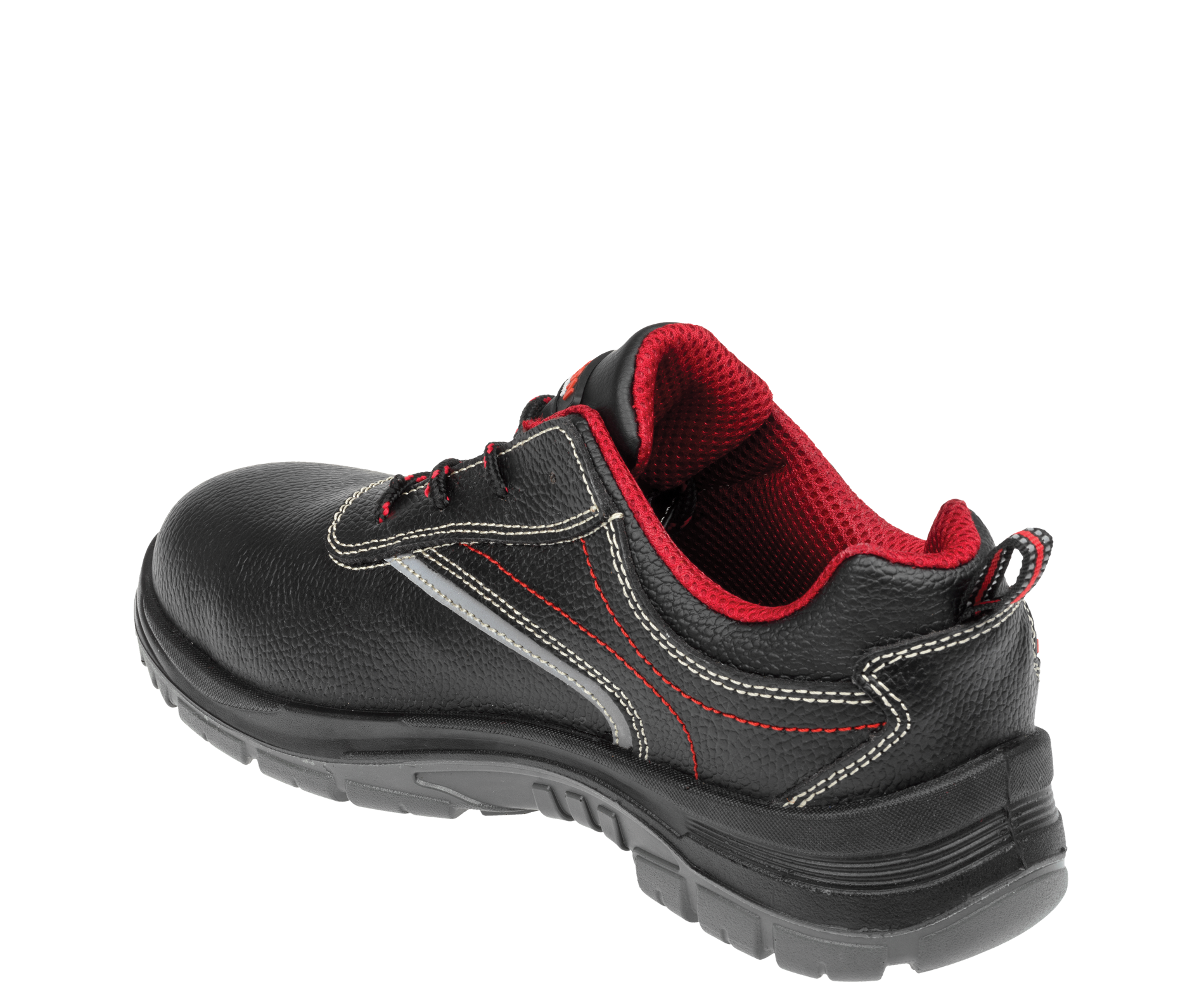 Dieser Schuh ist mit einem robusten Kevlar-Durchtrittschutz ausgestattet, der ein Durchstechen der Sohle von unten verhindert, sowie mit einer widerstandsfähigen Zehenschutzkappe aus Composite, die die Zehen bei einem Aufprall von oben schützt.